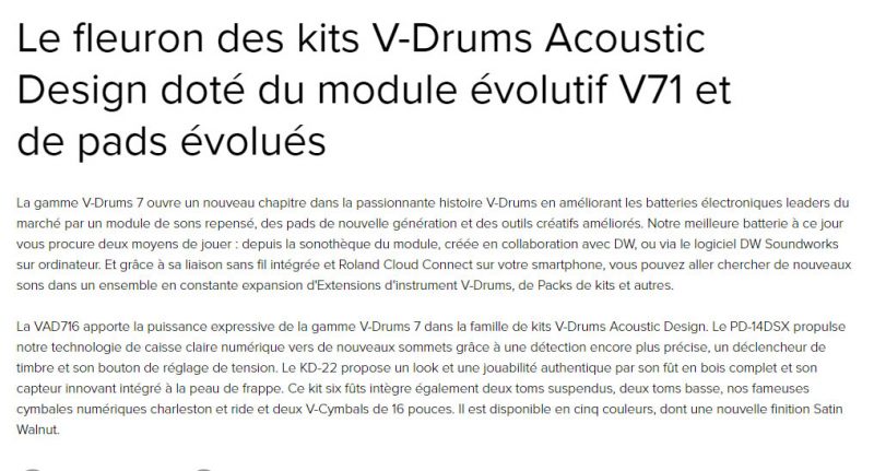 La batterie électronique ultime, technologie numérique issue de la fusion avec la marque américaine DW, fûts bois avec une finition exemplaire, la caisse claire, le charley et la ride ainsi que le module V71 n’ont pas d’équivalent sur le marché en terme de réalisme, jamais une batterie électronique n’aura été aussi proche de l’acoustique.